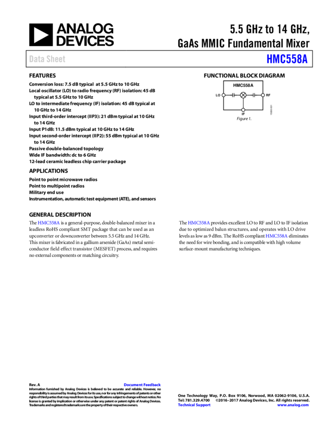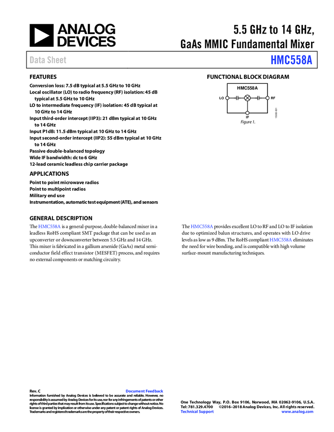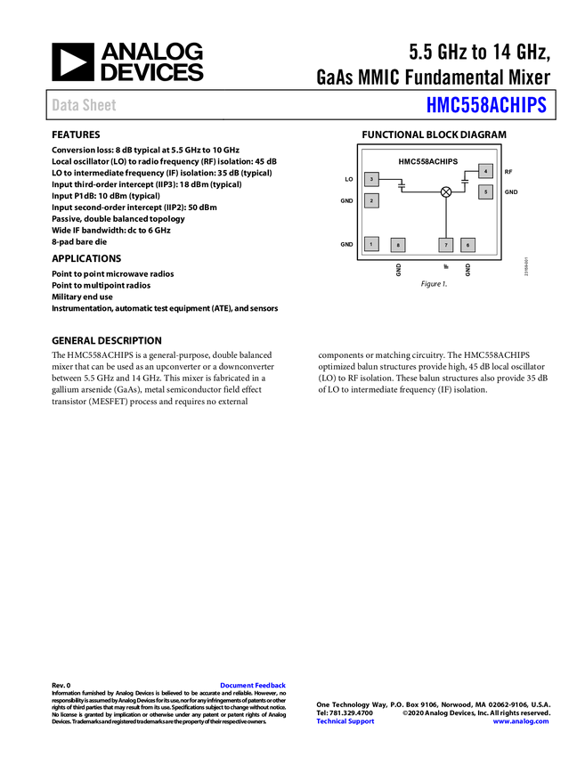 5.5 GHz to 14 GHz, GaAs MMIC Fundamental Mixer