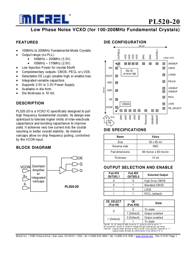 PL520-20 - Low Phase Noise VCXO (for 100-200MHz Fundamental Crystals)