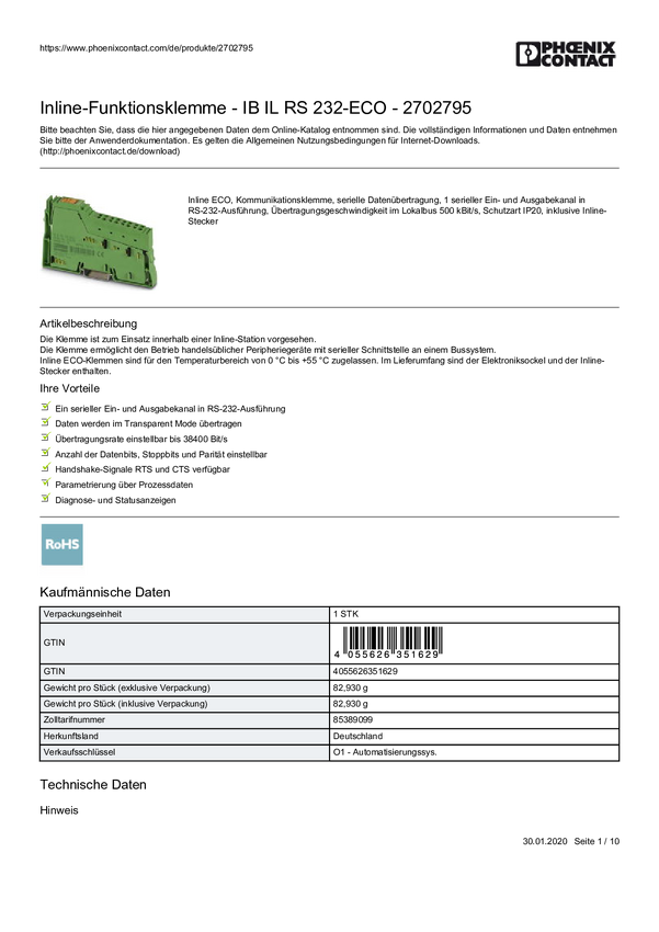 Phoenix Contact IB IL RS 232-ECO 2702795 Zacisk funkcyjny 7.5 V/DC