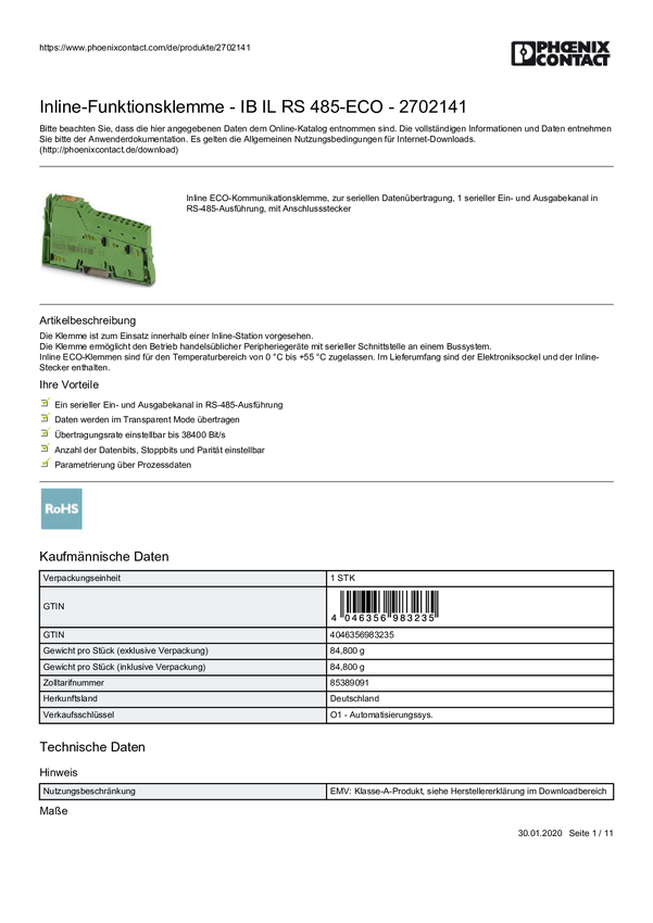 Zacisk funkcyjny Phoenix Contact IB IL RS 485-ECO 2702141, 1 szt.