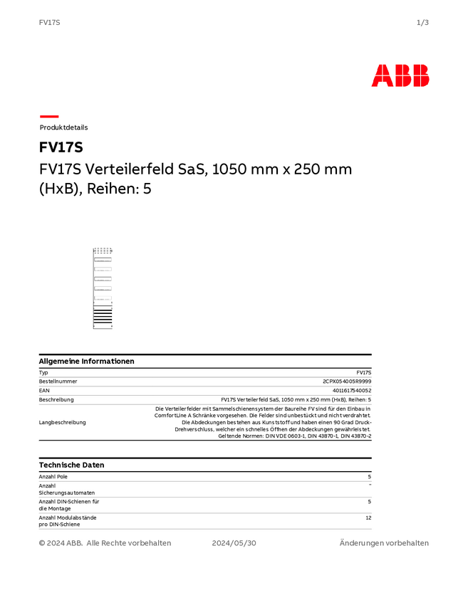 Striebel & John 2CPX054017R9999 FV17A2R5 Panel dystrybucyjny Ilość modułów = 12 Content 1 szt.