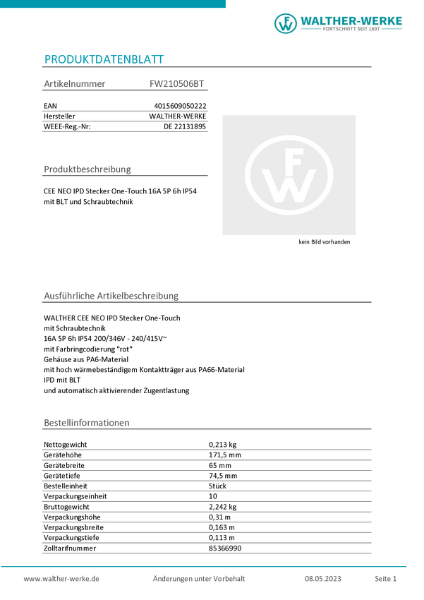 Złacze męskie CEE Walther Werke FW210506BT 16 A 200 V, 415 V