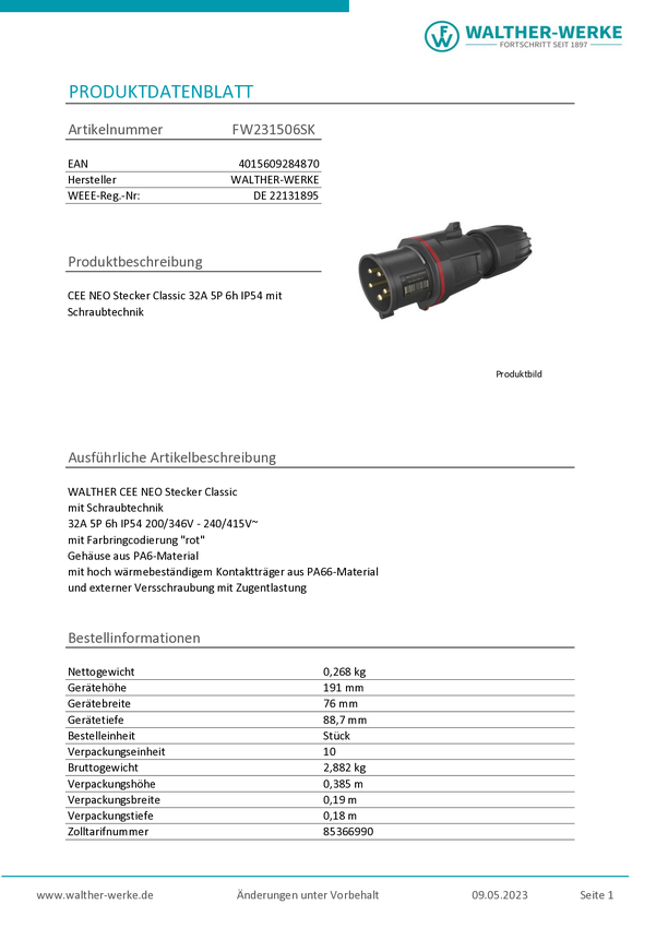 Złacze męskie CEE Walther Werke FW231506SK 32 A 200 V, 415 V
