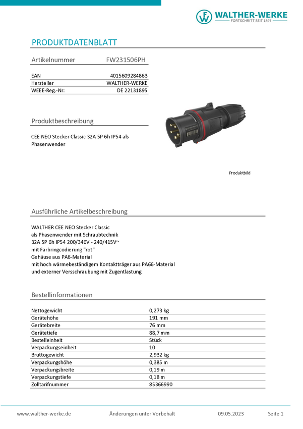 Złacze męskie CEE Walther Werke FW231506PH 32 A 200 V, 415 V