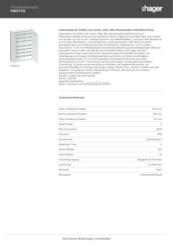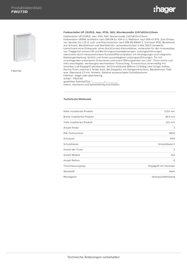 Rozdzielnica Hager FWU73A, 853 mm x 1153 mm x 125 mm, 1 szt.