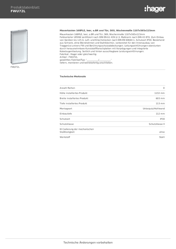 Hager FWU72L Skrzynka ścienna ścianki drążone Ilość rzędów = 0 Content 1 szt.