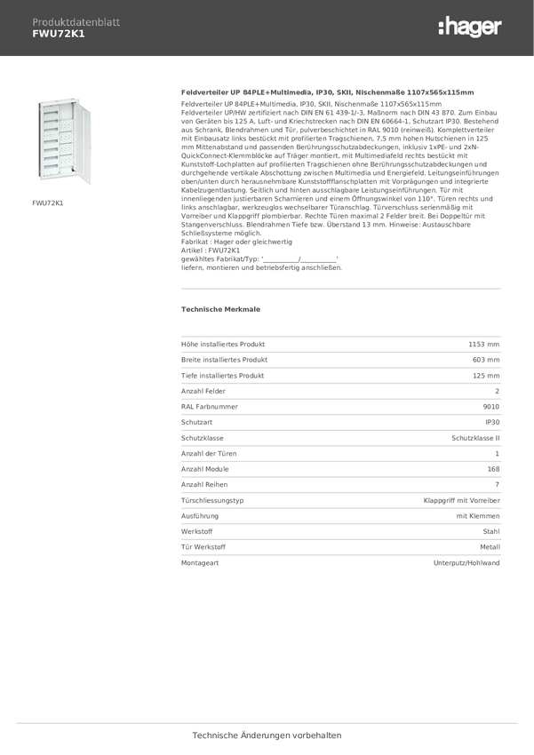 Rozdzielnica Hager FWU72K1, 603 mm x 1153 mm x 125 mm, 1 szt.