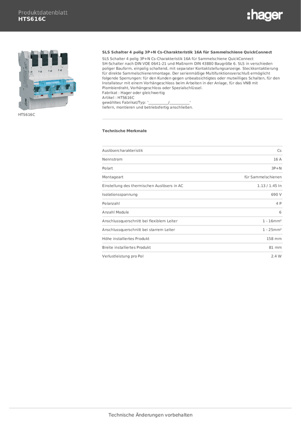 Wyłącznik główny bezpieczeństwa Hager HTS616C, 4 styki, 400 V, 16 A