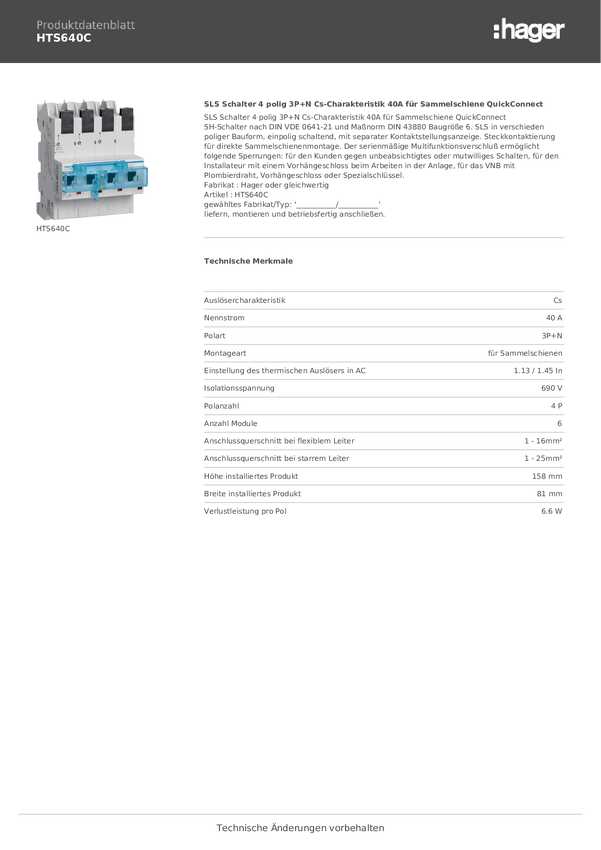 Hager HTS640C Wyłącznik główny bezpieczeństwa 4 styki 40 A 400 V