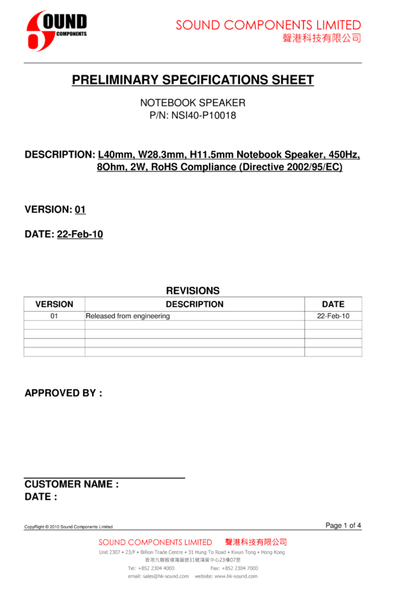 Głośnik, 8 Ohm , 2W, 450Hz-12kHz, fr=450Hz, 40x28.3x11.5mm