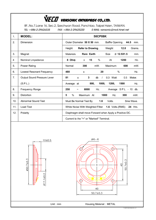 Głośnik stożkowy, 8Ω, 0.3W, 250Hz-6kHz, fr=480Hz, 50x50mm, h=10mm