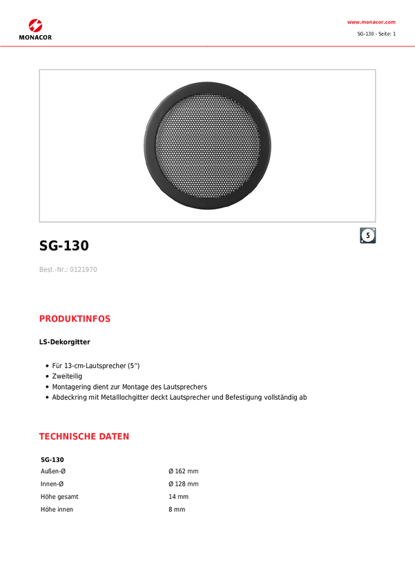 Monacor SG-130 Zaślepka głośnikowa (Ø x W) 162 mm x 14 mm