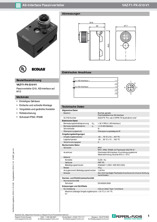 Rozdzielacz czujnik / element wykonawczy, pasywny Pepperl+Fuchs VAZ-T1-FK-G10-V1 216027 1 szt.