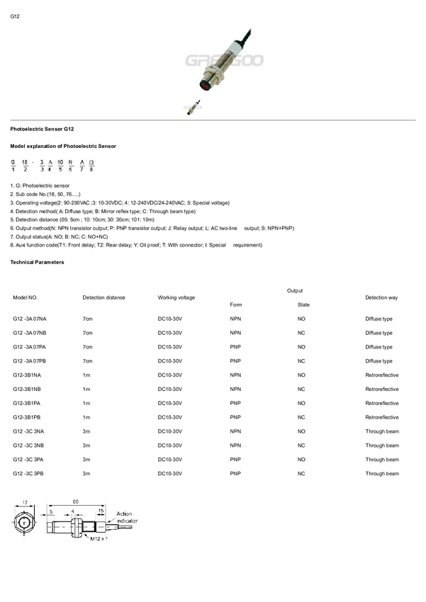 Czujnik; fotoelektryczny; G12-3C3PA; PNP; NO; bariera (nadajnik-odbiornik); 3m; 10÷30V; DC; 200mA; cylindryczny metalowy; z przewodem 2mb; Greegoo; RoHS