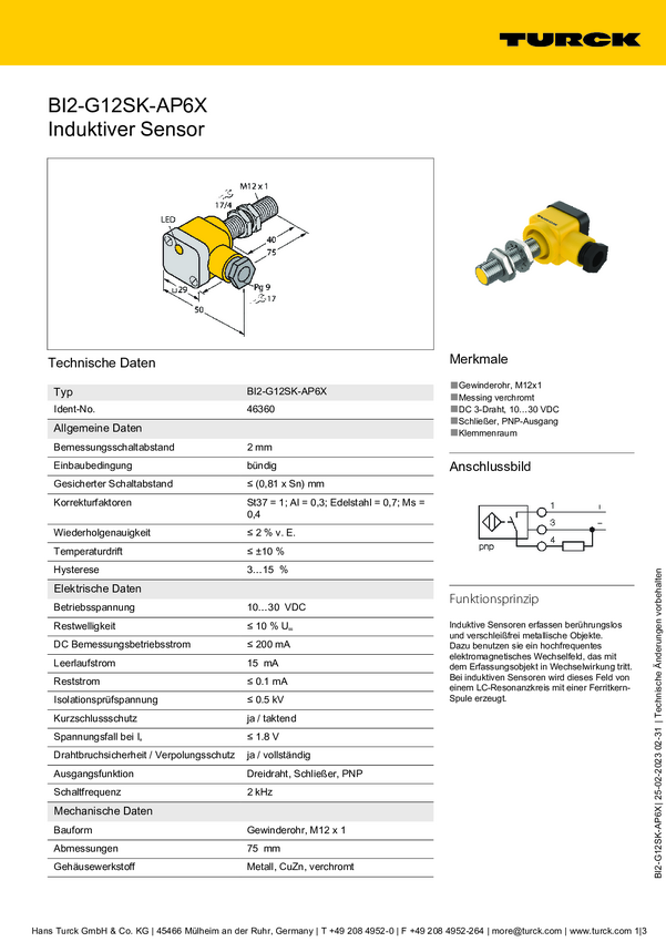 Czujnik indukcyjny Turck BI2-G12SK-Y1X, 1 szt.