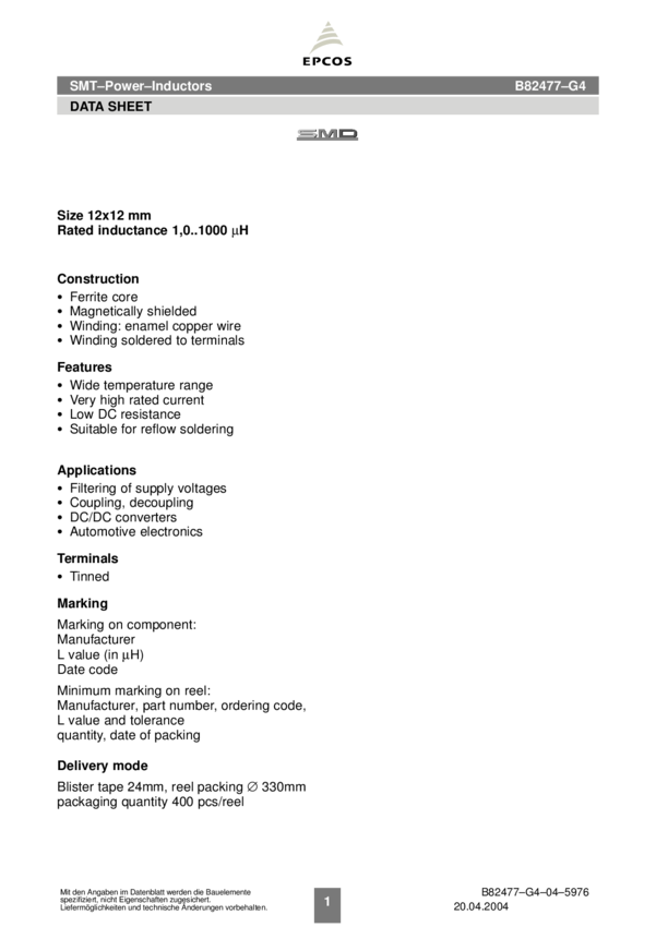 Ind Power Shielded 180uH 20% 100KHz Ferrite 470mA Blister T/R