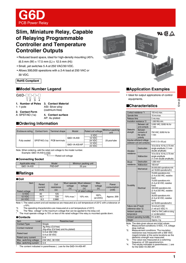 Przekaźnik; elektromagnetyczny; G6D-1A-ASI-24DC; 24V DC; 5A; 30V; SPST-NO 1 styk zwierny; na PCB; OMRON; RoHS