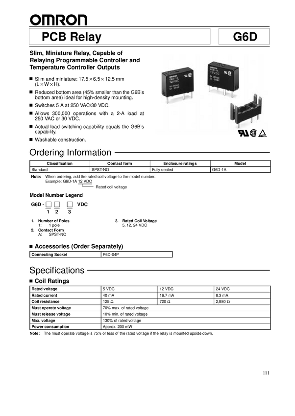Przekaźnik OMRON PCB, SPST-NO, prąd znamion 5A; seria G6D obudowa 17,5x6,5x12,5mm; 5V 125R