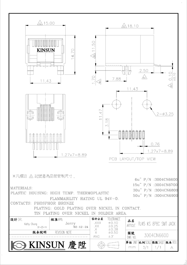Gniazdo , 4-stykowe, gabaryt 6, styki 6μ" Au, KINSUN