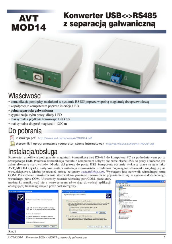 AVTMOD14 Konwerter USB -- RS485 z separacją galwaniczną