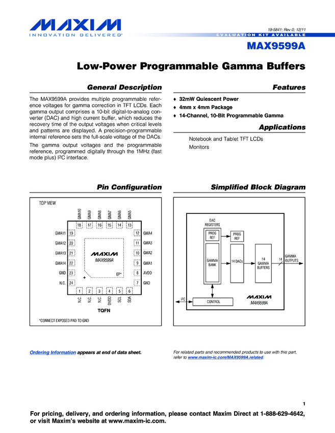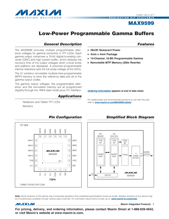 MAX9590 14 Programmable Gamma Reference Buffers with 4 Static References for TFT-LCD Displays