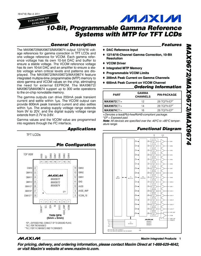 MAX9672, MAX9673, MAX9674 10-Bit, Programmable Gamma Reference Systems with MTP for TFT LCDs