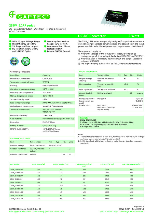 Gaptec 2S8W_0509S5.2RP Przetwornica DC/DC 2S8W_5.2RP, SIP-8 (7 Pins), 2 W, 222 mA, 1 szt.