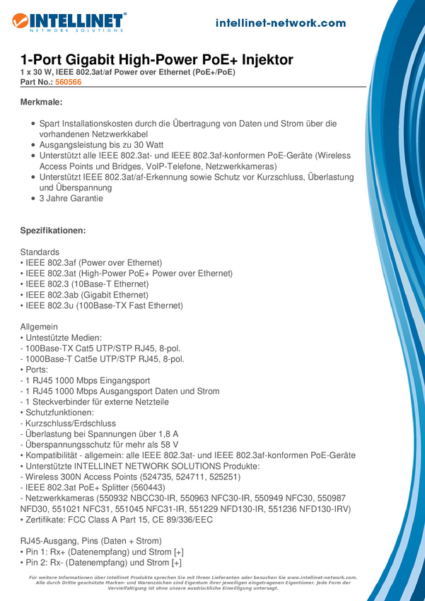 Injektor PoE Intellinet 560566, 1 GBit/s, IEEE 802.3at (25.5 W)