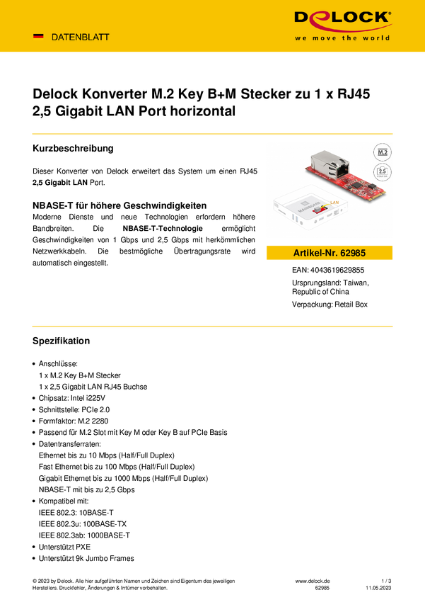 Delock 62985 62985 Konwerter interfejsów [1x RJ45 (1/2.5 Gbit/s) - 1x złącze męskie M.2 Key B, złącze męskie M.2 Key M]