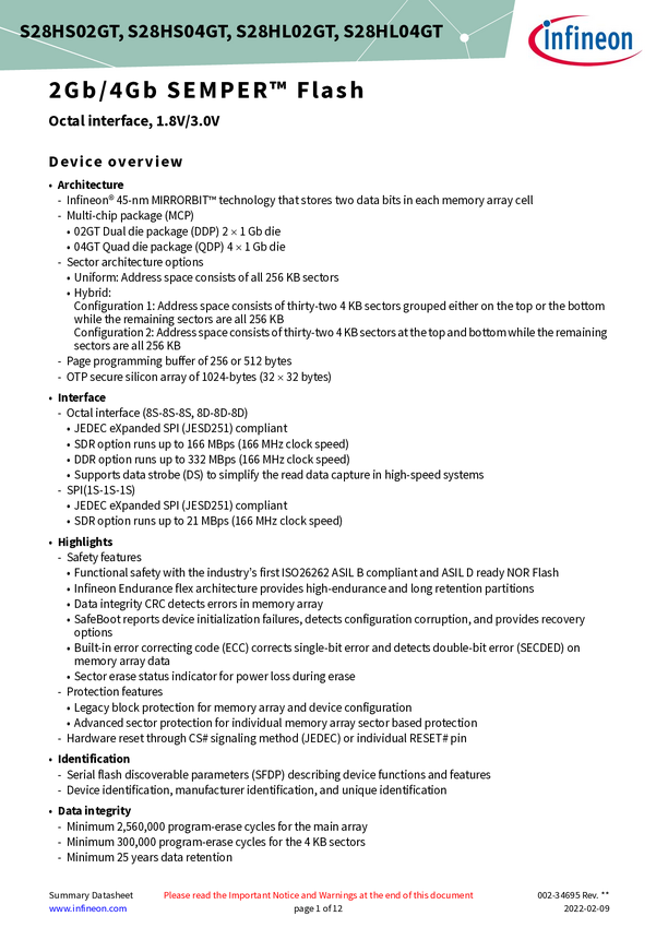 The S28HS02GTFPBHB153 is a SEMPER™ NOR Flash Memory product by Infineon. It is built for automotive applications, has an interface bandwidth of 333 MByte/s, and operates at 1.8V. With 2 Gbit density, it utilizes the Octal Interface and PG-BGA-24 package. The device is ISO 26262-compliant and leverages Infineon’s 45-nm MIRRORBIT™ technology to store two data bits in each memory array cell.