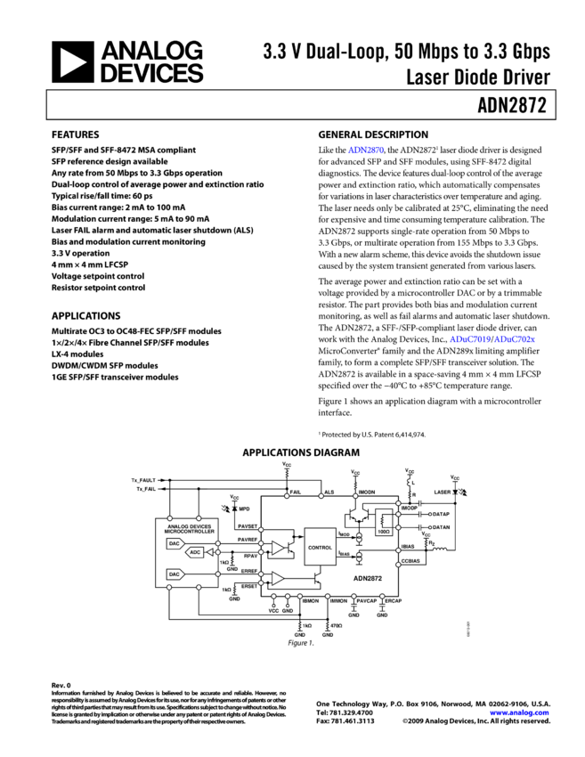 ADN2872: 3.3 V Dual-Loop, 50 Mbps to 3.3 Gbps Laser Diode Driver