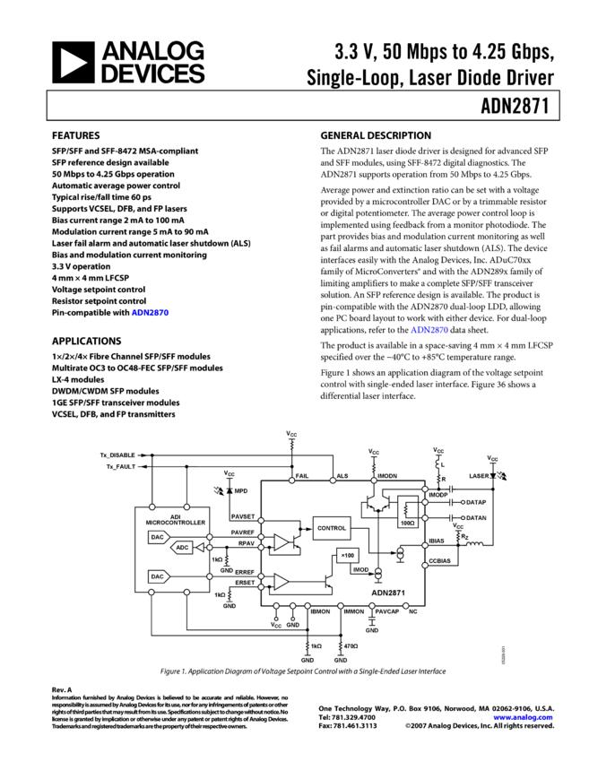 ADN2871: 3.3 V, 50 Mbps to 4.25 Gbps, Single-Loop, Laser Diode Driver