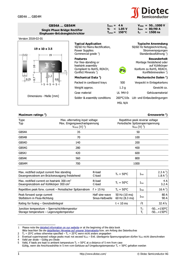 Diotec GBS4J Prostownik mostkowy GBS_SIL-1.5-2.3 600 V 2 A
