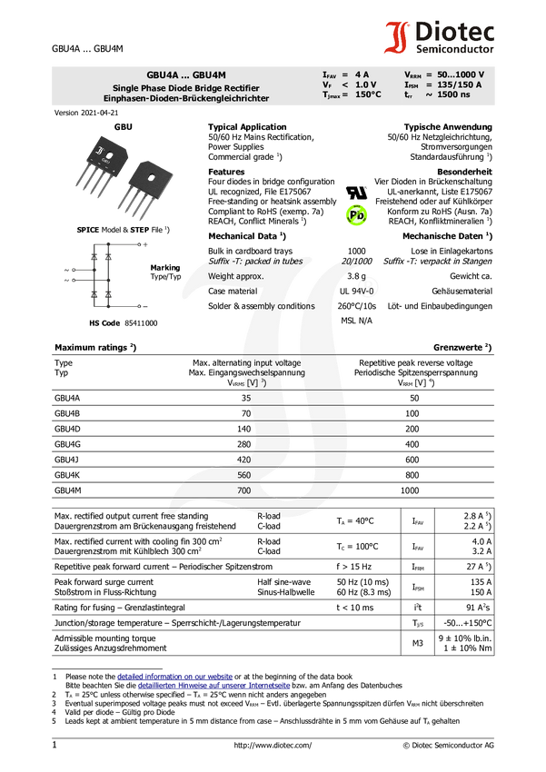 Diotec GBU4D Prostownik mostkowy GBU 200 V 4 A