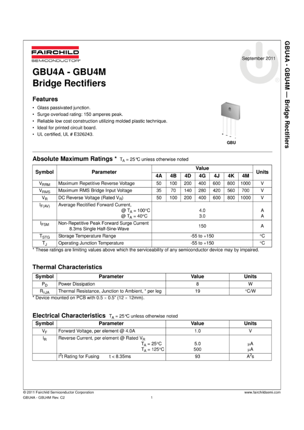 Diode Rectifier Bridge Single 400V 4A 4-Pin GBU Bulk