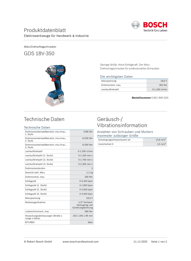 Bosch Professional GDS 18V-350 06019M5020 Wkrętarka udarowa akumulatorowa 350 Nm 18 V