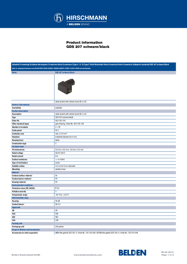Złącze kablowe przykręcane czarny GDS 207 Ilość styków:2 + PE 933 138-100-200 Hirschmann Zawartość: 1 szt.