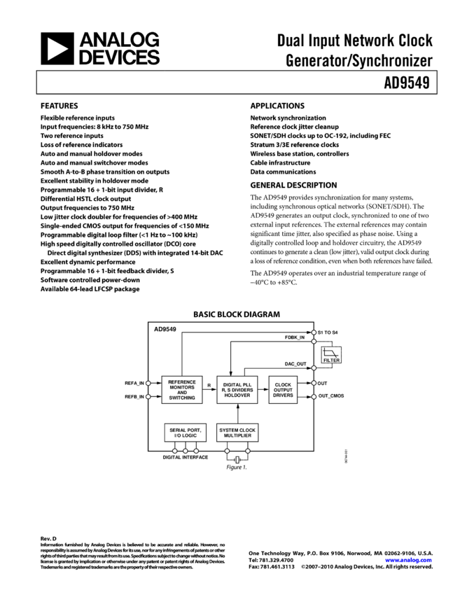 AD9549: Dual Input Network Clock Generator/Synchronizer