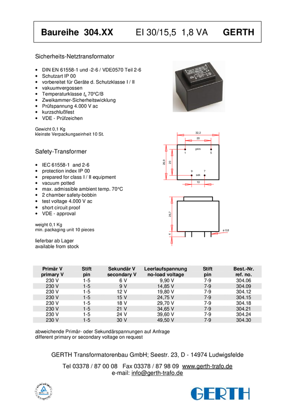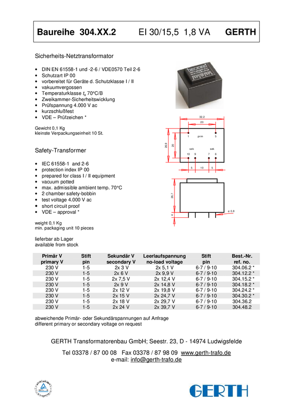 Transformator do PCB, EI 30/15,5 Gerth PT301502 230 V N/A N/A 1.8 VA