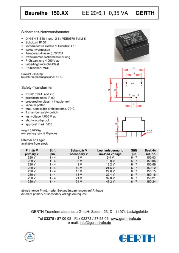 Transformator do PCB, EE 20/6,1 Gerth PT151201 230 V N/A N/A 0.35 VA