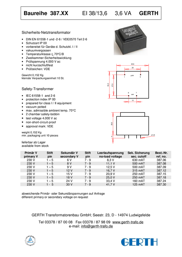 Transformator do PCB, EI 38/13,6 Gerth PTG386002 230 V N/A N/A 3.6 VA