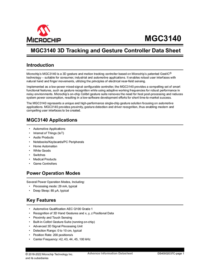 MGC3130 Single-Zone 3D Gesture Controller Data Sheet (08/12/2013)