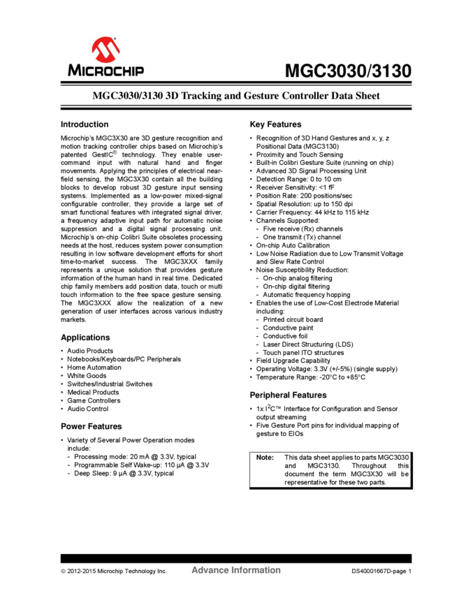 MGC3030/3130 3D Gesture Controller Data Sheet (01/15/2015)