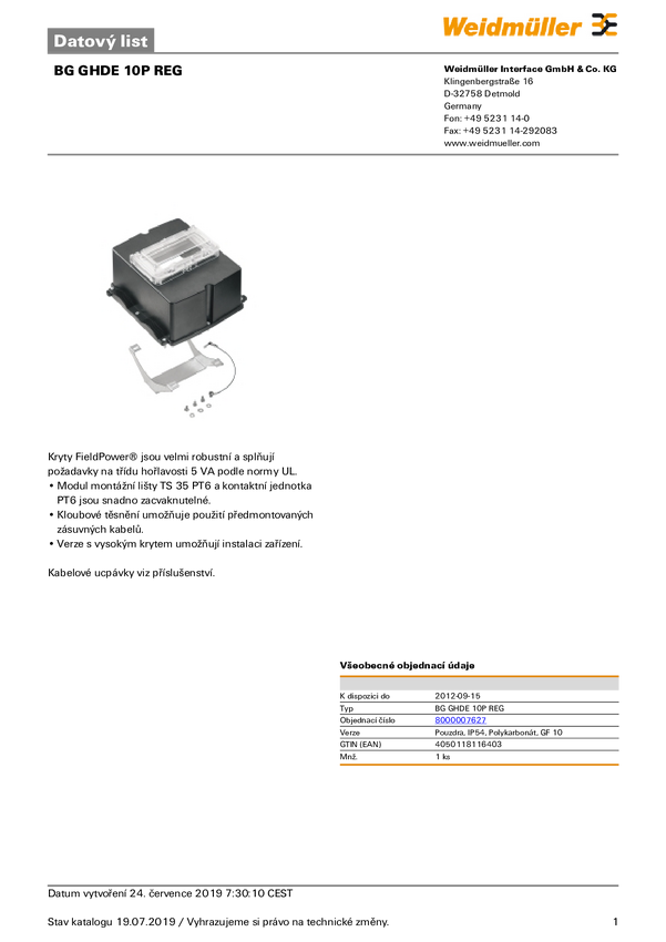 Pokrywa obudowy Weidmüller BG GHDE 10P REG 8000007627 1 szt.