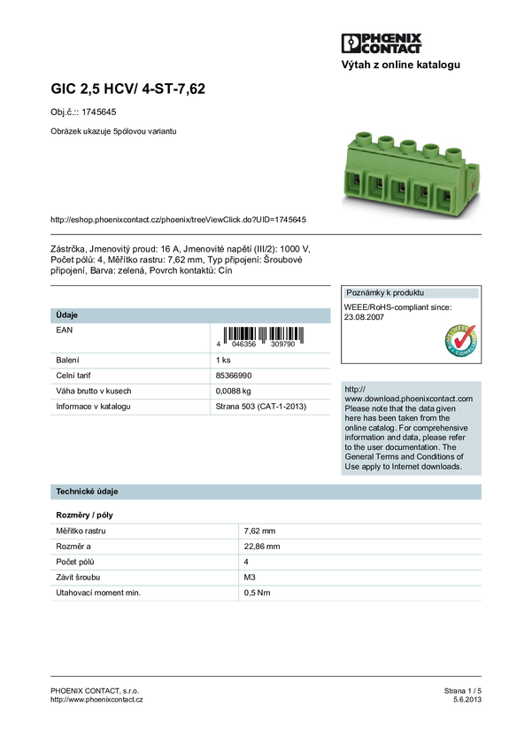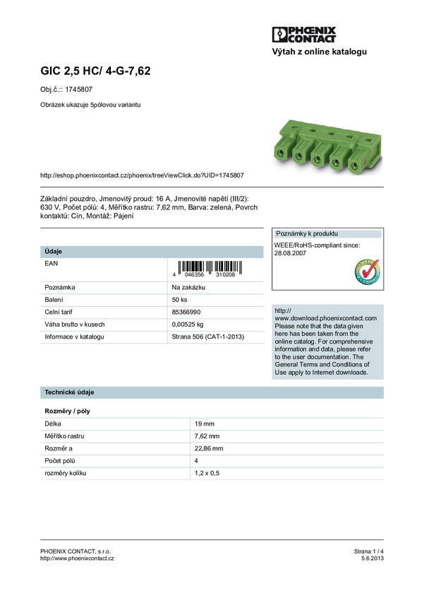 Phoenix Contact 1745645 Obudowa złącza pin żeńskiego na PCB GIC 2,5 HCV/ 4-ST-7,62, wire-to-board, piny: 4, 16 A, 50 szt