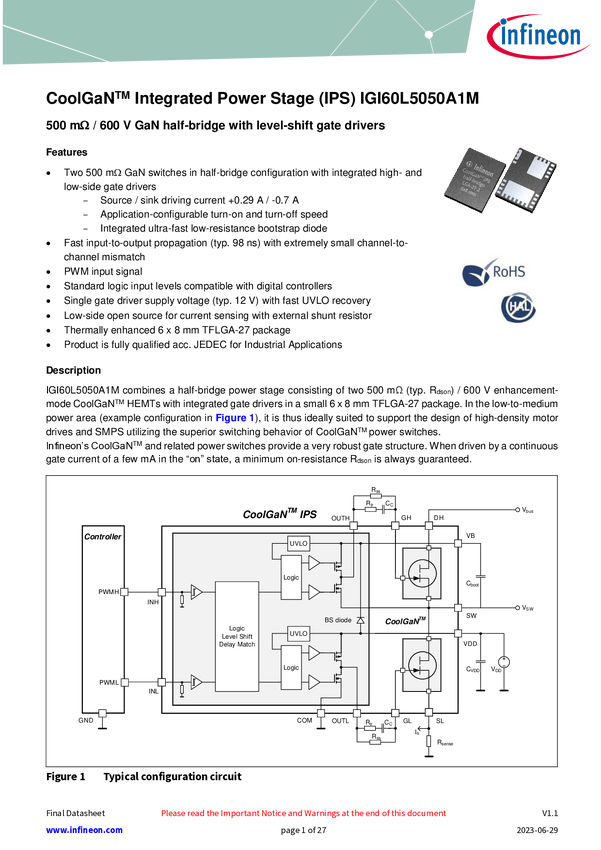 The IGI60L5050A1M combines a half-bridge power stage consisting of two GaN HEMTs with level shifters in a small 6 x 8 mm PG-TFLGA-27-2 package. The device uses the Infineon CoolGaN™ GIT which offers the highest Figure-of-Merit (FOM) and robustness. The internal bootstrap diode means that with minimal external components, designers can achieve full control to tune the rise/fall times while maintaining a simple system BOM. This is ideally suited to support the design of compact appliances in the low power app
