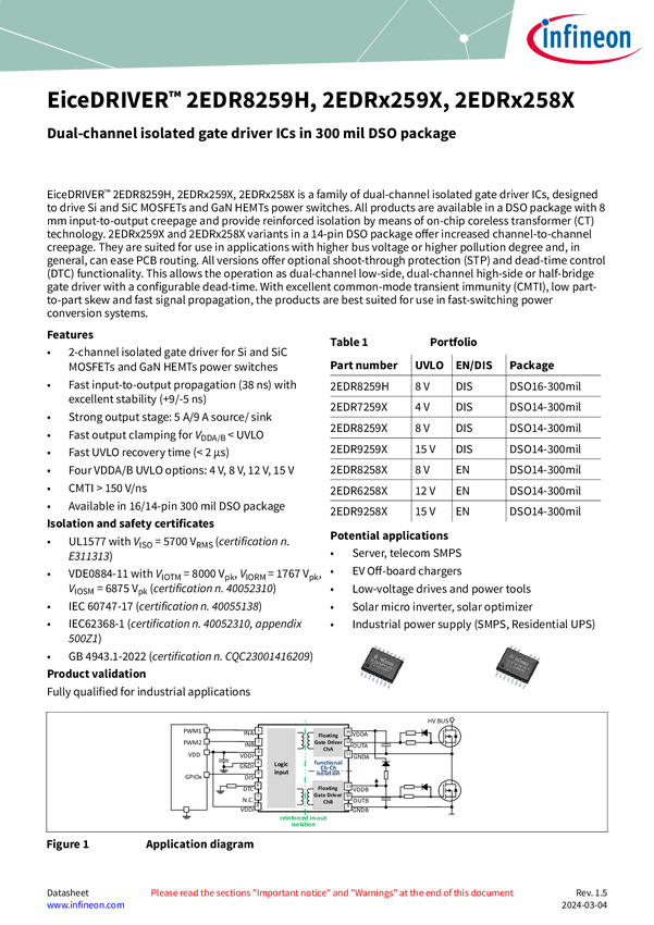 Fast, robust, dual-channel, functional isolated MOSFET gate drivers with accurate and stable timing. The EiceDRIVER™ 2EDR8258X is a reinforced isolated gate driver IC for control over the mandatory safe isolation barrier in SMPS. The strong 5A/9A source/sink gate driver features a high 150V/ns CMTI for robust operation with CoolMOS™, CoolGaN™ GIT HEMTs and high-power switching noise environment. The short propagation delay of 38ns is provided with low variation over temperature, enabling the power system d