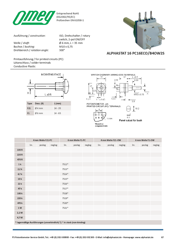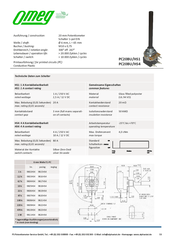 Potencjometr z przełącznikiem Potentiometer Service GmbH PC20BU/HS4 CEPS F1 L:65 B10K