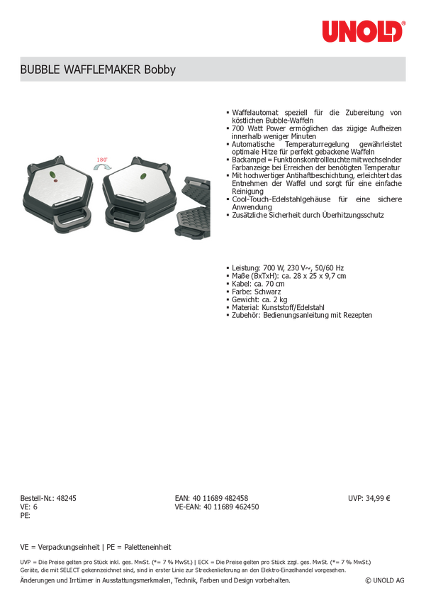 Unold Bobby Gofrownica obudowa Cool-Touch, powłoka nieprzywierająca, automatyczna regulacja temperatury czarny, stali sz