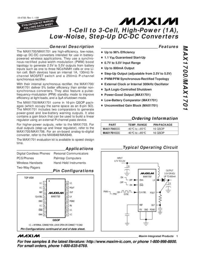 MAX1701 1-Cell to 3-Cell, High-Power (1A), Low-Noise, Step-Up DC-DC Converter with Power-Good Output